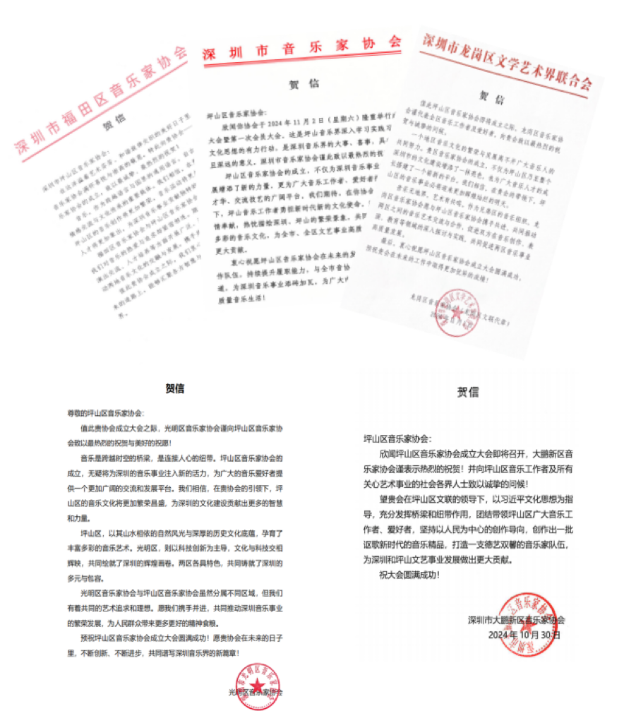 深圳市音乐家协会、福田区音乐家协会、龙岗区音乐家协会、光明区音乐家协会、大鹏新区音乐家协会等向大会发来贺信,对坪山区音乐家协会成立表示祝贺,并期盼未来与坪山区音乐家协会开展广泛交流合作,共同推动音乐文化交融与发展,携手并进,共创辉煌,为深圳文艺事业发展作出更大贡献。